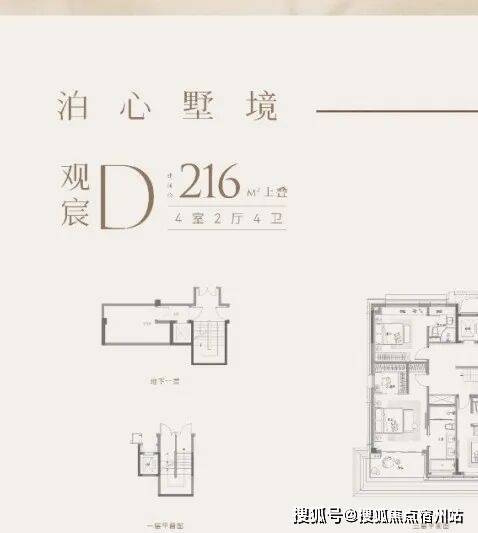 户型特点:下叠边套,南向面宽约9米,客餐厅同宽约5.8米,空间开阔。一楼设南向卧室,采光好且视野佳。二楼为三套房+主卧总统套房设计,主卫南向,可容纳浴缸和双台盆。地下室方正,附赠采光井,利用率高。