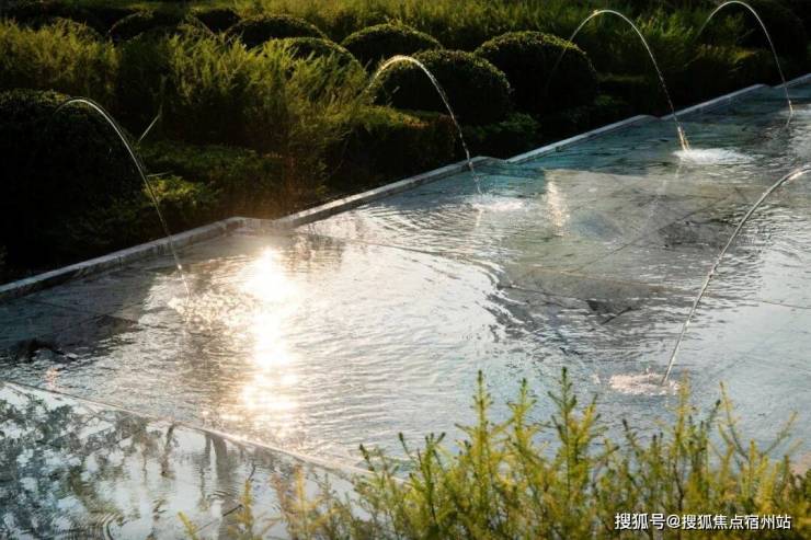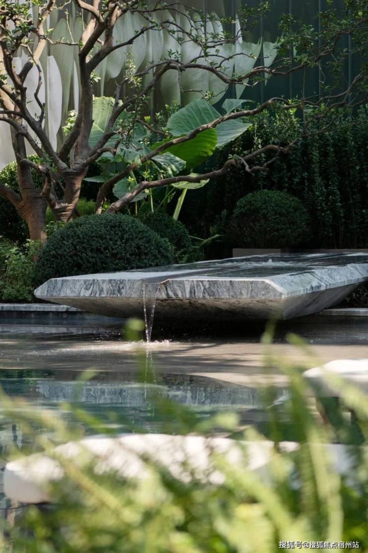 花池与水台的交界近景,借由地形高差,让水景与绿植形成丰富层次,以现代手法将自然意趣浓缩于一方天地,两种质感、深浅的体块嵌合之美,涌泉隐没在体块间,在日常风景里增加一点诗意的氛围。