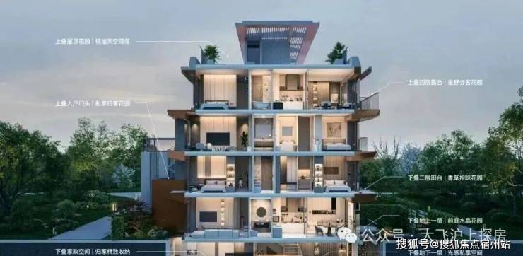 不止做了架空层,数量更是高达9个。下沉式会所则包含了多功能厅+泳池+健身区+超大水景庭院。