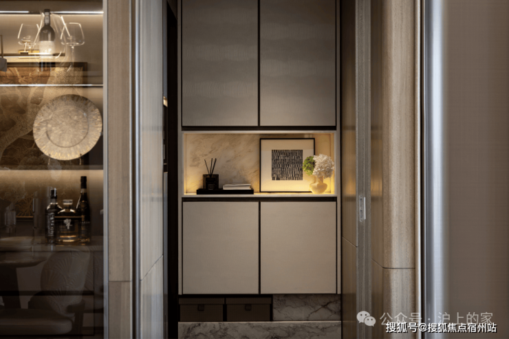 入户玄关,采用黄金白玉的台面,打开灯光立马呈现出宫廷的视觉感,配上BV式的皮革包边,顶豪的即视感也不过如此。