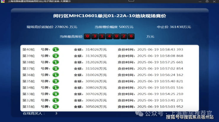 6月19日,闵行1幅地块出让,地块名称为颛桥镇MHC10601单元01-22A-10地块,规划用地性质为住宅用地,出让面积4.05公顷,容积率为2。经过40轮竞拍,最终由上海保利城市发展有限公司竞得,总成交价314026万元,溢价率12.95%。
