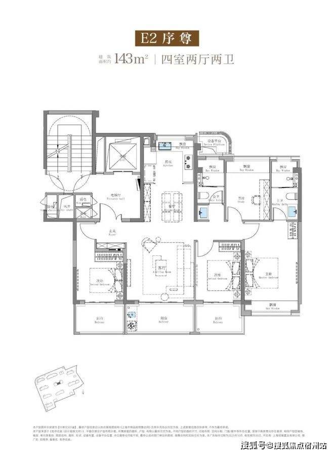 但为更好的放大整个户型的视野,项目在东/西两侧放了双阳台+约270°的主卧飘窗,保证了视野的最大化。
