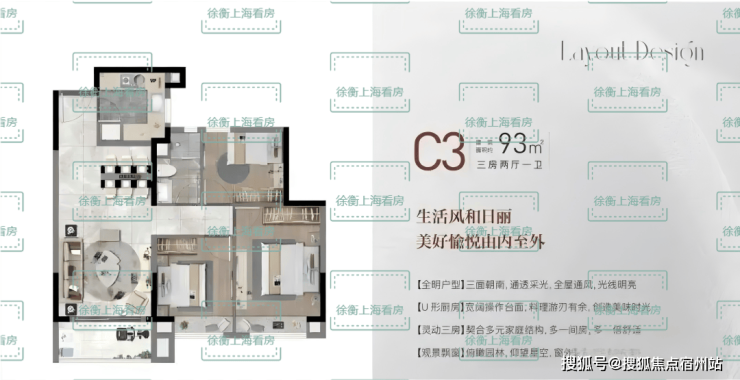 建面C3户型93㎡3房2厅1卫,做到了三开间朝南+双卧室带飘窗+动静分离,室内通透明亮。客餐厅一体化,客厅南连宽景阳台,整体采光和通透性非常好。该户型非常适合或三口之家或二胎家庭居住,空间尺度绰绰有余。