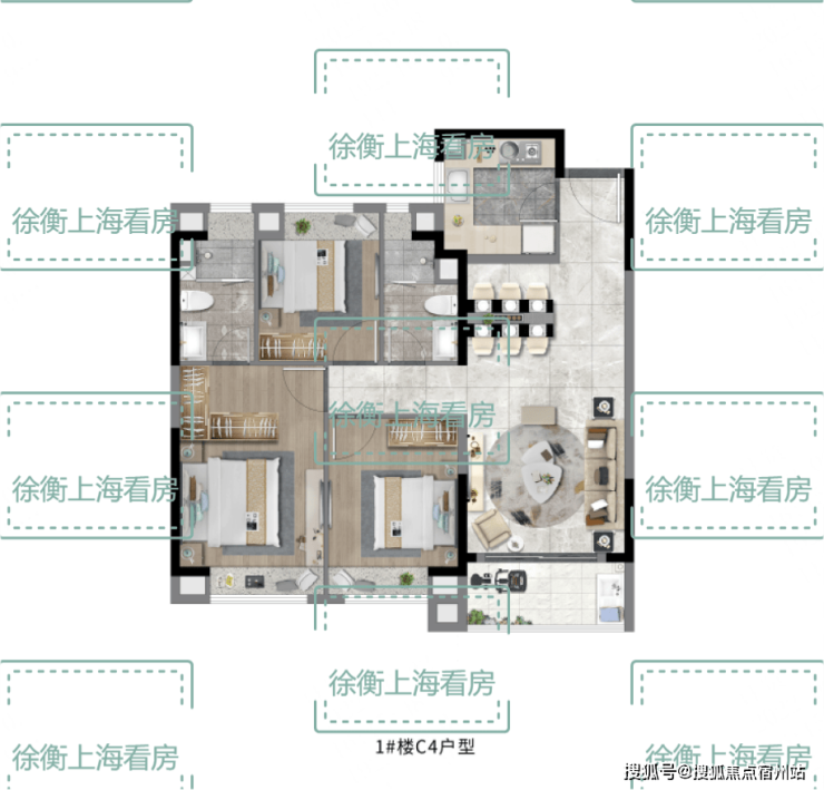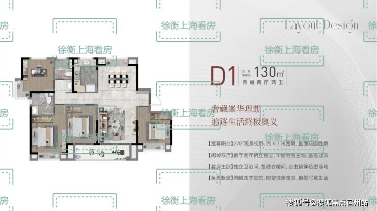建面D1户型130㎡4房2厅2卫,做到了四开间朝南+南北通透+主卧套房设计+双阳台设计+卫生间干湿分离,“一步到位”大4房,空间尺度非凡。客餐厅相对独立,客厅+次卧南连约6.7米宽景阳台,餐厅北连大飘窗,层高3米,室内空间尺度瞬间体现出来;主卧套房设计,带飘窗+卫生间,专属于主人的私密空间;双次卧带飘窗,室内通透明亮;
