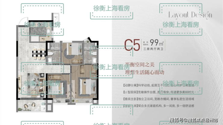 建面C5户型99㎡3房2厅2卫,做到了三开间朝南+动静分离+南北通透+双卧室朝南+主卧套房设计+明厨明卫,室内通透明亮。客餐厅一体化,且空间相对独立,客厅南连宽景阳台,加上层高均3米,尺度感和空间感铺展开来;主卧套房设计,带飘窗+衣帽间+卫生间,专属于主人的私密空间;该户型非常适合或三口之家或二胎家庭居住,空间尺度绰绰有余。