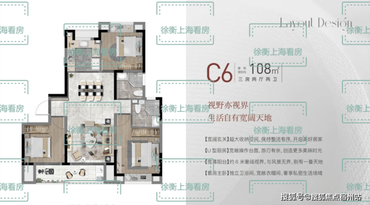 建面C6户型108㎡3房2厅2卫,做到了三开间朝南+双阳台设计+主卧套房设计+南北通透,该户型得房率非常高。客餐厅一体化,再加上无过道设计,到各个功能间都是零距离,大大提升了空间利用率;双阳台设计,客厅+次卧南连宽景阳台,室内的采光度非常优秀;主卧套房设计,带独立卫生间和飘窗,专属于主人的私密空间;该户型东西侧的卧室,让三代同堂家庭、不同作息的主人们生活之间相互不打扰。