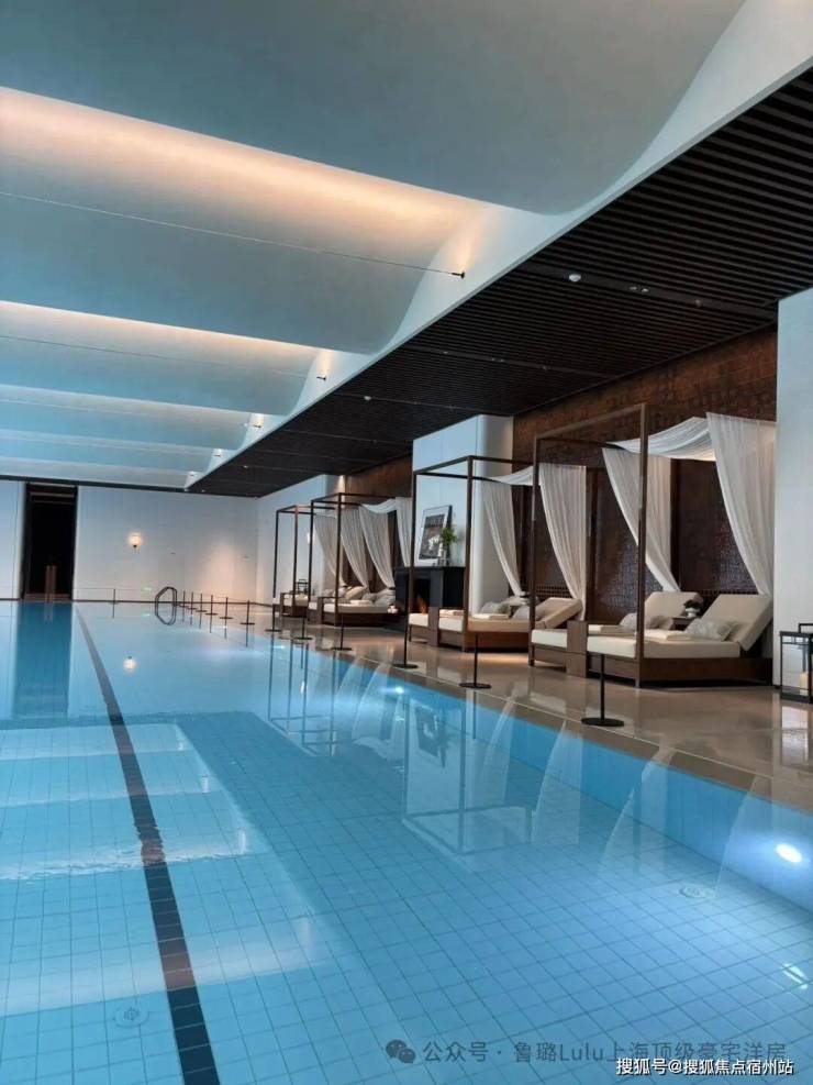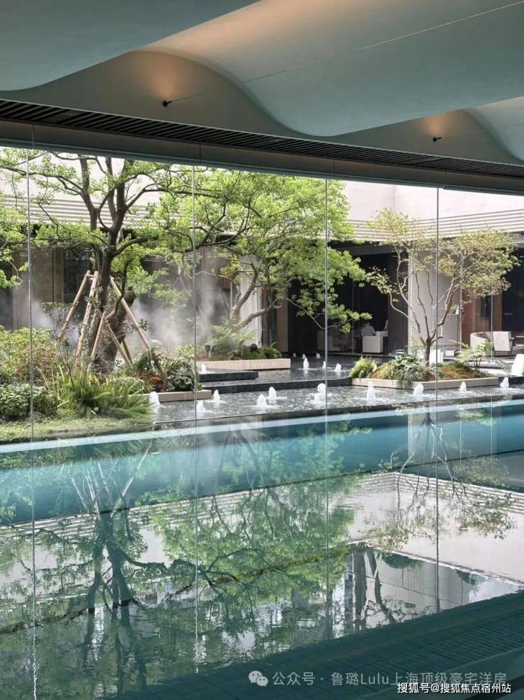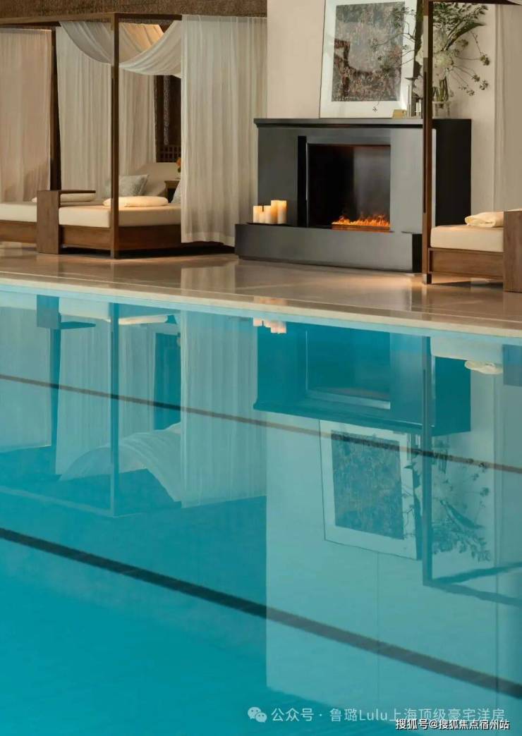 最后来看泳池。云邸玖章做了再升级。改为采用大尺度的落地玻璃拼接, 约2.4米宽巨幅玻璃, 且通过精致的玻璃交接细节处理增进室内外空间的融合,强调泳池的无界感,真正实现了无边泳池的效果、质的飞跃。