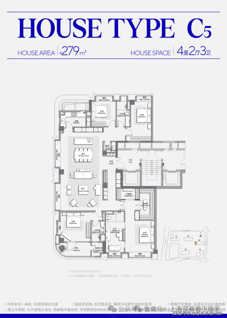 高端品质:由17家国际事务所联合设计,公区采用全进口石材铺设;室内配备嘉格纳四件套、劳芬卫浴等高端品牌洁具,装修标准对标豪宅水准。