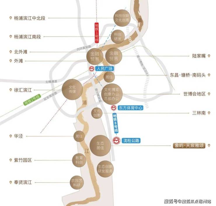 从上图可见,这两个滨江黄金三角的商业、产业、生态资源就在闵行浦江的正上方。但其房价早已是高攀不起,世博17万/㎡、徐滨冲20万/㎡,前滩二手房价已达14-15万/㎡(数据来源:链家网)!对比之下,仅6站地铁距离的浦江板块,显然性价比更高,未来潜力巨大。而且象屿·天宸雅颂占据黄浦江中上游生态链的黄金中轴,前景可期!