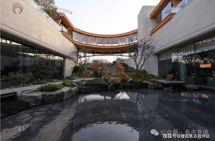 园林以仇英《桃花源图》为灵感,引溪为脉,形成游龙入境般的归家动线。沿台地花园漫步,可见约450㎡开阔水院映照云天,与“桃花坞”相望,营造出“天空之镜”般的诗境。