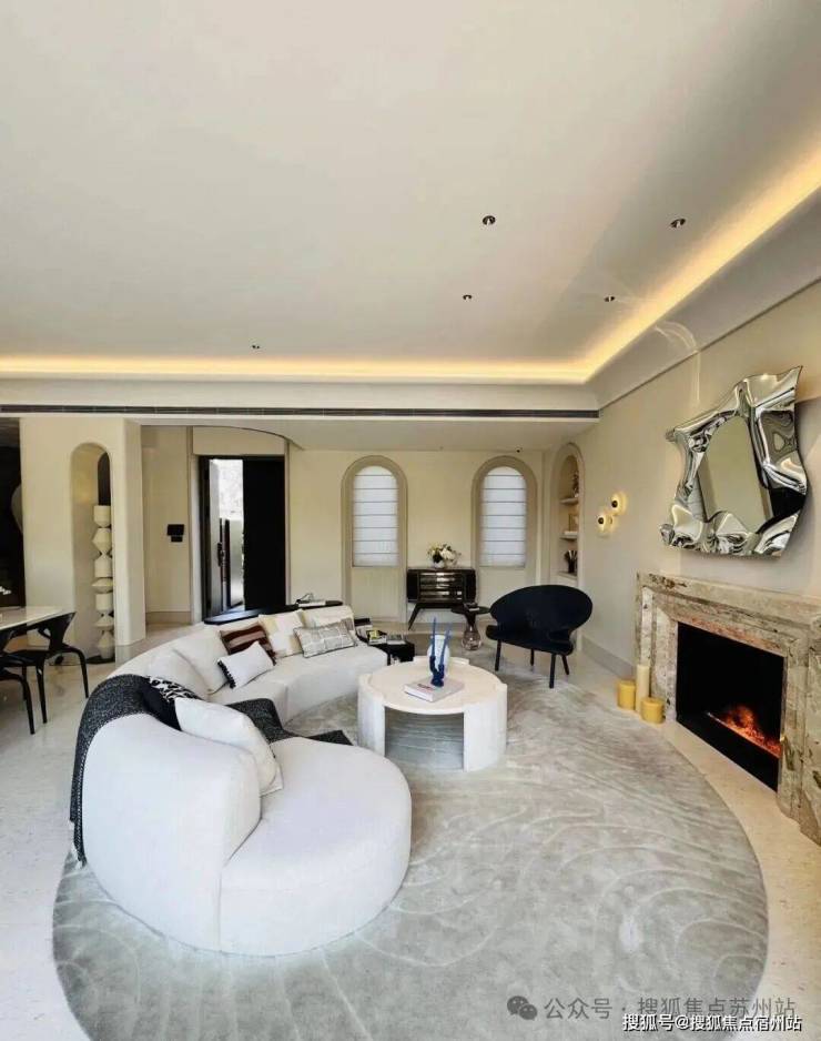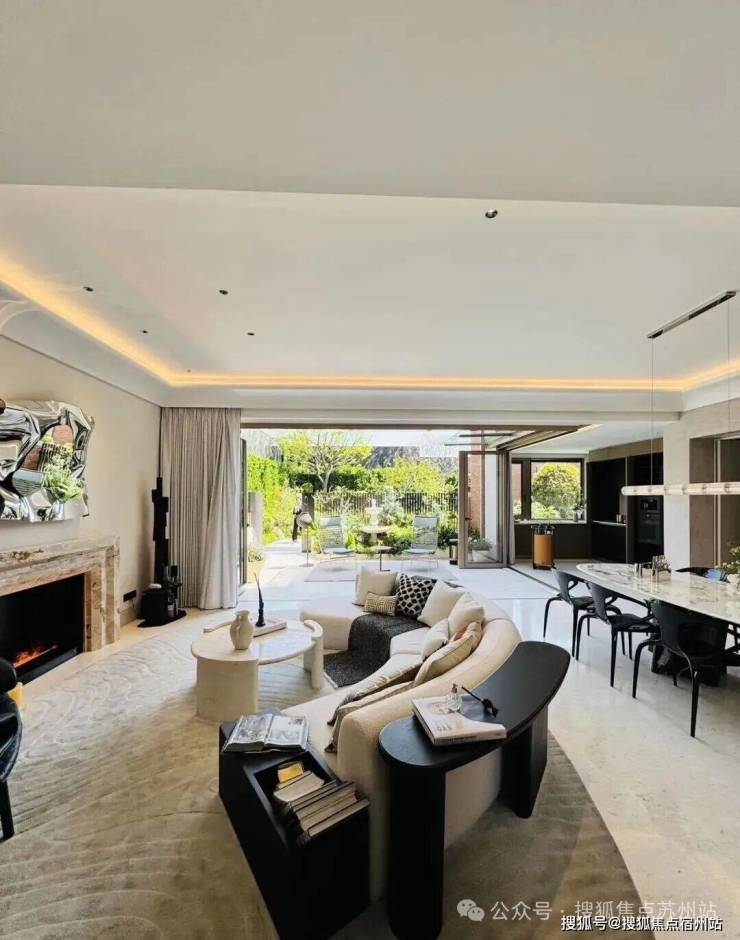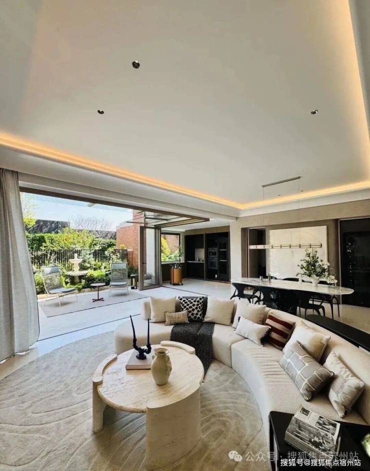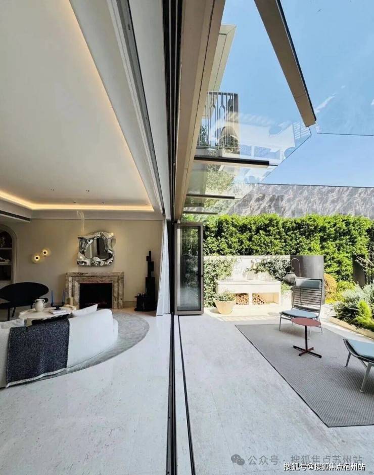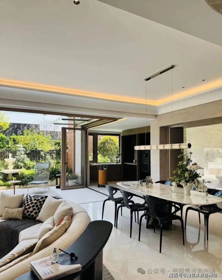 「无界空间」:客厅270度转角无柱设计,搭配落地玻璃,开阔视野将院中风景迎入日常。