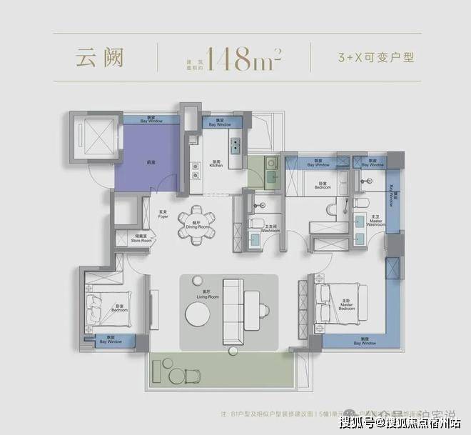 其三,LDKG一体化设计,将客厅、餐厅、厨房与阳台融合,形成约34㎡的超大会客厅,6.8米南向大横厅可灵活改造X空间(改造后),满足家庭影院、亲子互动等多元需求;