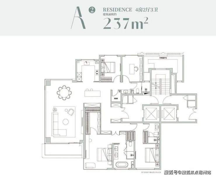 该户型是经典的四叶草布局,四开间分布在四角,兼顾私密与互动,是二胎家庭的优选;