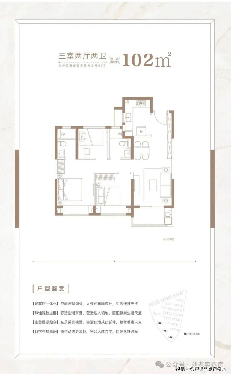 建面约102㎡3房2厅2卫户型,做到了三开间朝南+双朝南卧室带飘窗+动静分离+卫生间干湿分离,采光面拉到极致!是一个非常方正的户型。