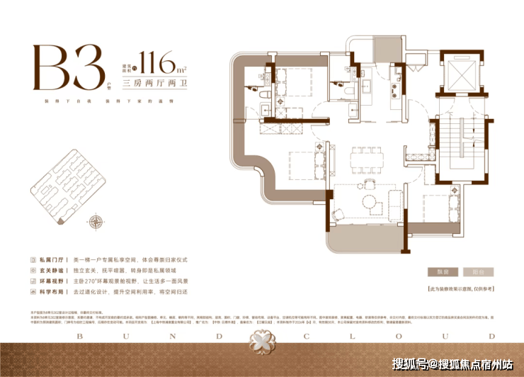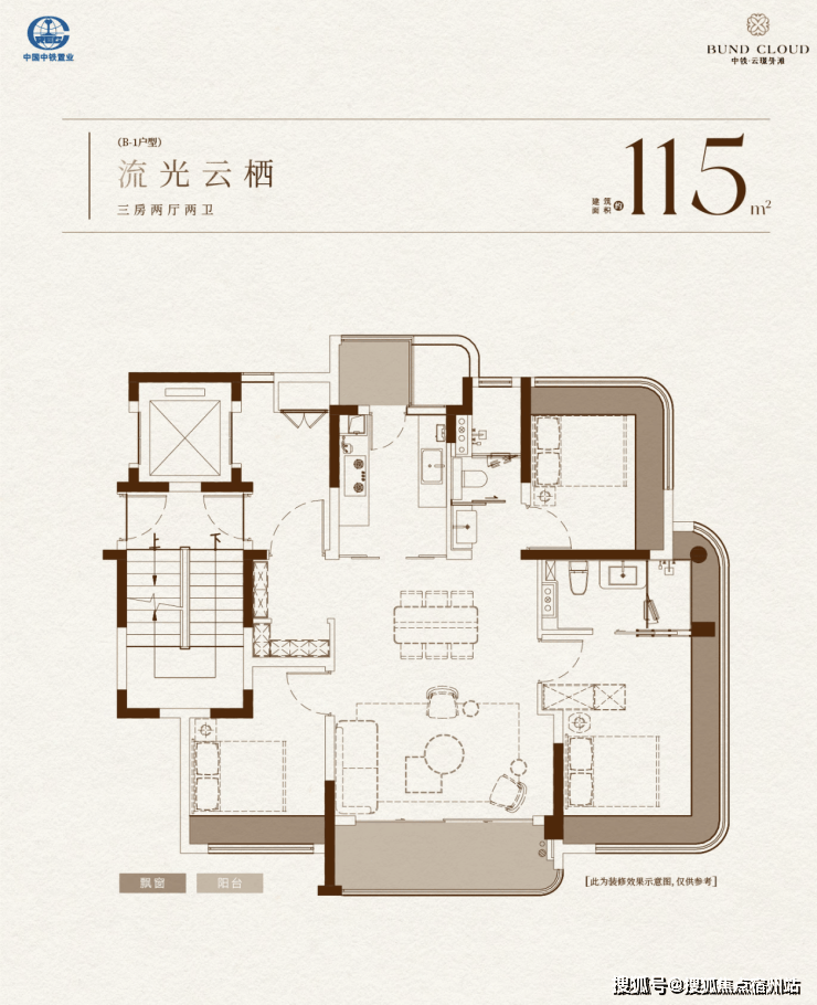 115㎡三房两厅两卫 :类一梯一户,独立玄关,三开间朝南,南向宽厅约 4.9 米,LDKB 一体化,南北双 270° 飘窗,全屋收纳充足,总价约 1150-1500 万。