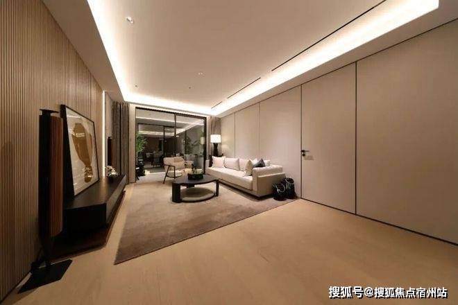 客厅无主灯、隐藏式的空调出风口、木饰面电视机背景墙、内嵌式的金属踢脚线,极简风审美呈现: