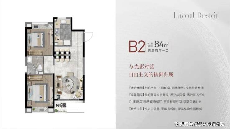 建面约84㎡2房2厅1卫,做到了 双开间朝南+双卧室带飘窗+动静分离,非常宽敞的2房户型。
