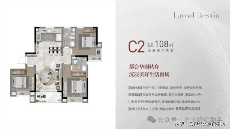 建面约108㎡3房2厅2卫,做到了 三开间朝南+双阳台设计+主卧套房设计+南北通透,该户型得房率非常高。