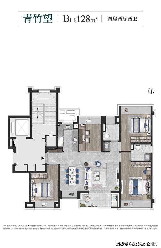 建面约128㎡的四房设计,在空间上使用功能更加扁平化,一站式解决了家庭生活的所有功能,优化居家动线,大大提升空间的居住体验。