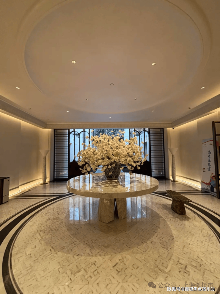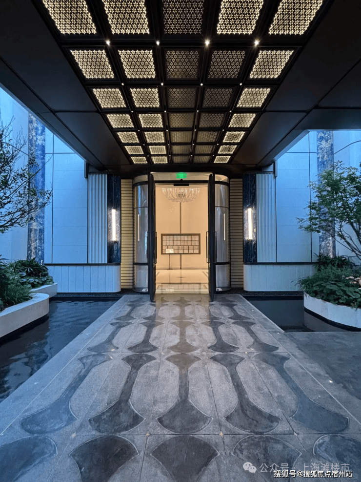 门庭延街的外立面,以精工定制弧形 米色石材 为主调,镶嵌典藏级 老虎玉大理石 ,点缀 古铜色现代海派艺术感灯器 ,整体呈现出百年海派的贵雅气质。