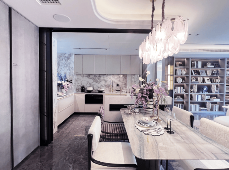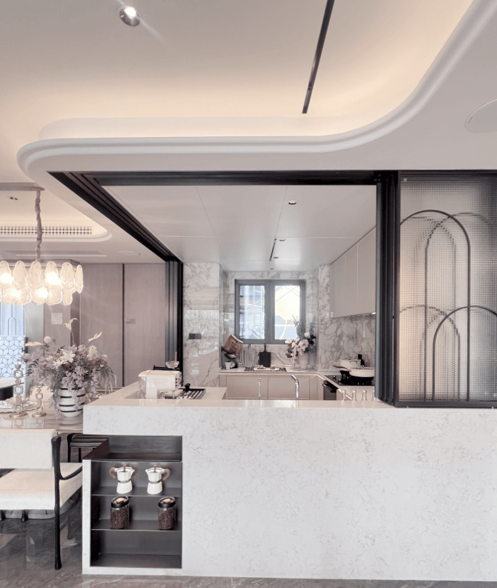 再来看玻璃移门,极窄边上吊柜设计,玻璃花纹做了特殊化处理,将项目logo演绎后纹入,同样的处理也在空调风口、入户门和套内门体现,提供了更高的仪式感,代表的是象屿业主的圈层文化。