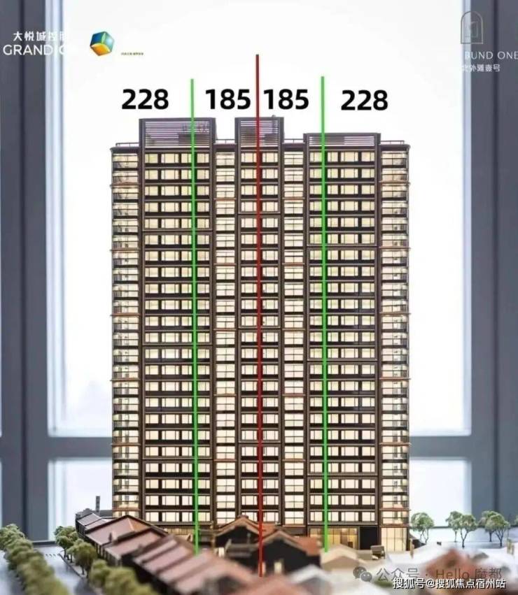 首开将90套大平层一次性推出,其中包含185平46套,228平44套,均价14.38万,最高价也只有16.6万,定价并不算离谱。