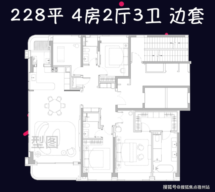 边套228平4房3卫,总价2677—3794万,空间感要强不少。