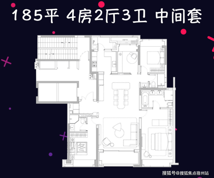 中间套185平4房3卫,总价2188—2804万,采用四叶草布局,空间没有太多过道浪费,两个南向套房设计也比较实用。