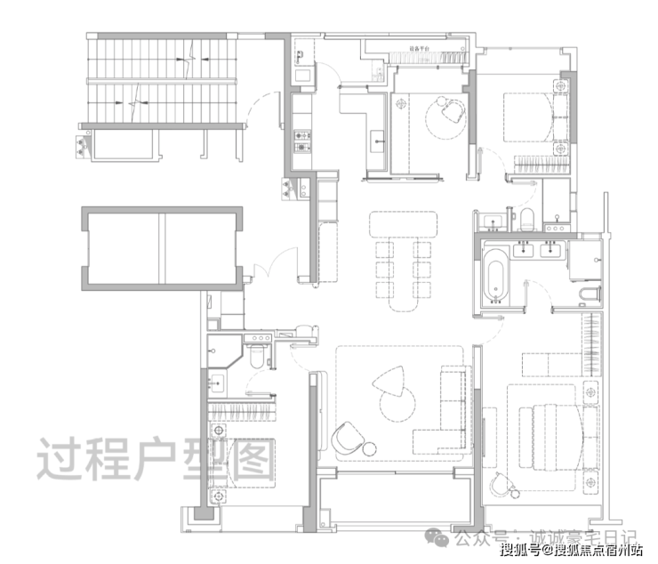 南向双套房+北向类套房设计,使三个房间分散于房子的三个方位,内部私密性十足。