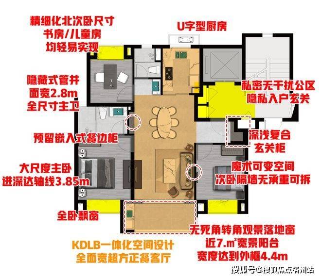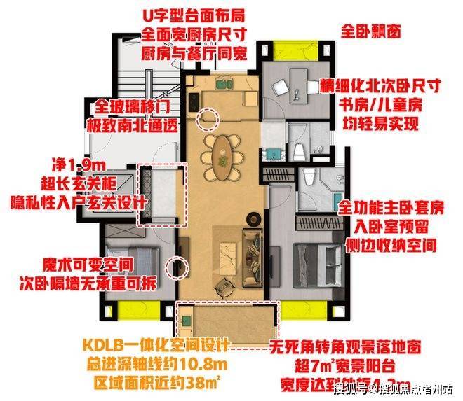 入户玄关及超大玄关柜设计,三开间朝南飞机户型,KDLB一体化设计,客厅次卧魔术可变空间,U型厨房,大尺度宽景阳台+转角观景落地窗,舒适北卧,三段式干湿分离客卫,全卧室飘窗,等等