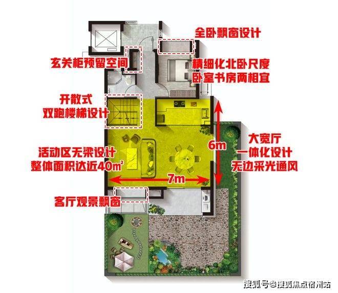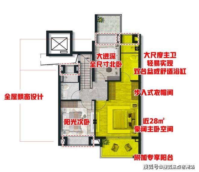 大尺度宽景阳台,宽度达到外框4米2,面积超7平米;转角观景落地窗设计,打造舒适休憩体验。