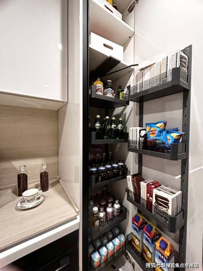 可抽拉的零食柜、厨房抽屉式碗碟拉篮、包括卫浴的收纳墙,于细节之处见真章。
