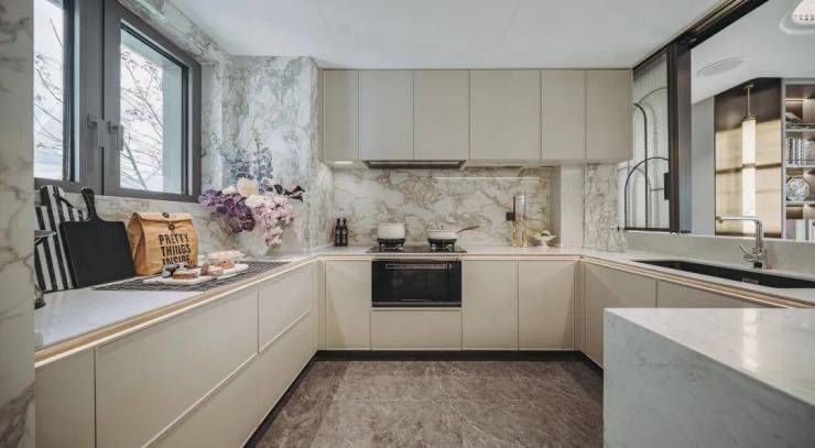 比如厨房的一圈橱柜都是飘窗,水槽也是。这样还能多出一个岛台空间,做饭的时候能和家人交流,象屿天宸雅颂,打造更有交流感的餐厨区域。