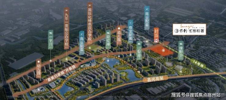 计划引入 九年一贯制公办教育、民办学校 (国际化特色办学),规划打造 10公顷迎虹湖、带主题滨水公园的15公顷绿野谷公园 等配套。