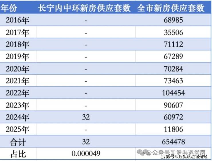 近10年(2016年至今)全上海合计入市新房65万多套,其中属于长宁内中环的只有32套,占比仅约0.000049!不到10万分之五的机会,臻稀程度简直爆表!