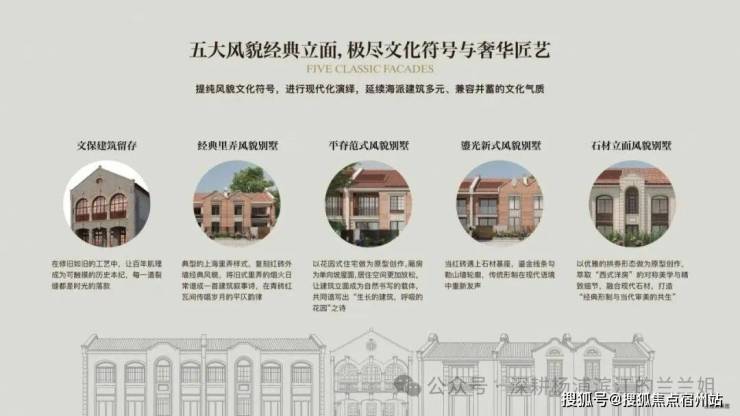 除了户型设计上的全面创新,项目还是 全上海第一个多元化形态风貌别墅新房,引入了 5大经典风貌建筑制式,让产品立面形态更加多样: