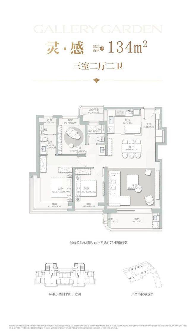 建面约134㎡3房2厅2卫, 主力总价约1500-1700万,户型设计在上一个户型的基础上将各功能间尺度升级的同时,也做了一些更人性化的迭新。