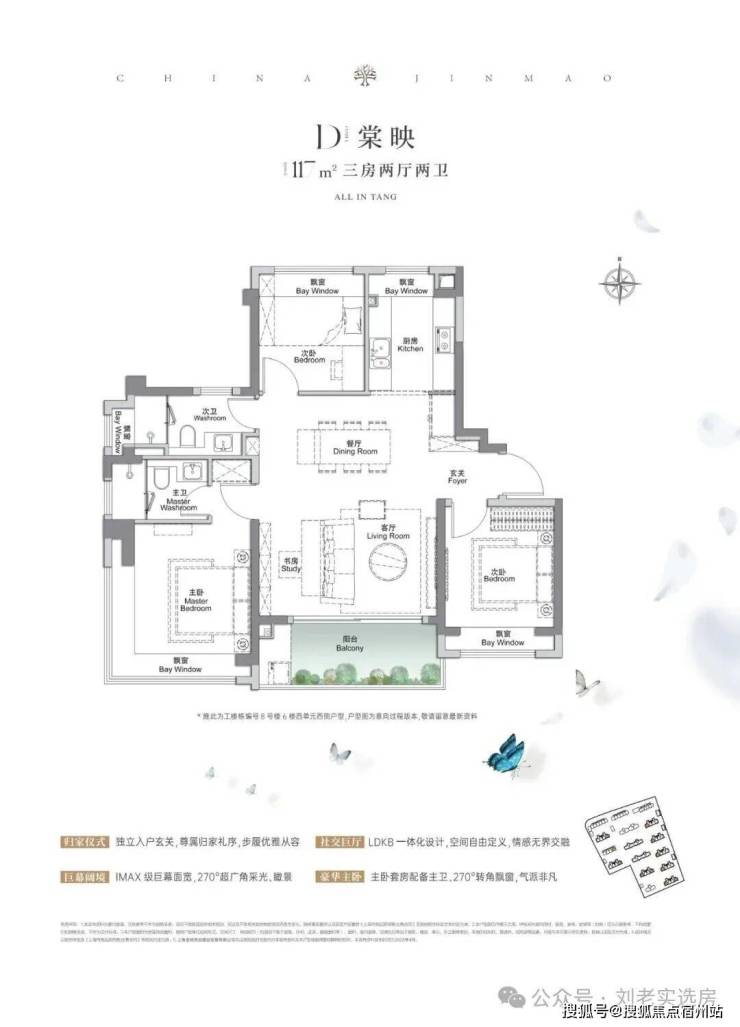 建面约105、117㎡3房2厅2卫,空间布局非常相似,都做到了三开间朝南+多个飘窗+主卧套房设计+270°转角飘窗。