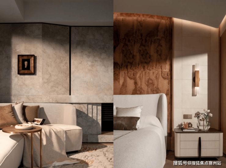 奢材的遴选,是对“权力美学”的深度呼应:玄关处白雪公主玉石,以通透莹润的肌理,像月光倾泻般铺就外滩私邸 “入门即尊荣” 的隐喻;祥云灰水墨岩延展地面的流动诗意,与外滩华尔道夫同源共生;而最为珍稀的,当属主卧背景墙上威尼斯安缦级树瘤木与巴黎宝格丽同源羊皮纸的邂逅——两种天然文明在此对话,营造出一种可被触摸、被感知的官邸奢感。