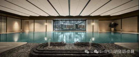 恒温泳池: 第一,采用了景德镇烧制的陶瓷马赛克,独特的釉面色彩由景德镇老师傅手工浇筑而成,充满人文艺术底蕴;第二,羽毛天花造型,由600余件铝板打造,表面采用了仿贝壳纹的艺术漆处理,带来松弛度假感;第三,不仅配置了约25m×10m的4道泳池,还采用了奥运会同款空调除湿系统,彰显高档品质细节!