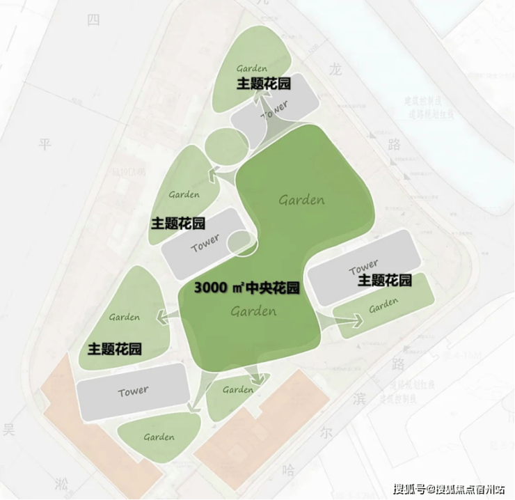 社区景观上,突破市区项目常见的「兵列树阵式」布局,通过建筑楼体的精密偏转,形成罕见的围合式社区形态。