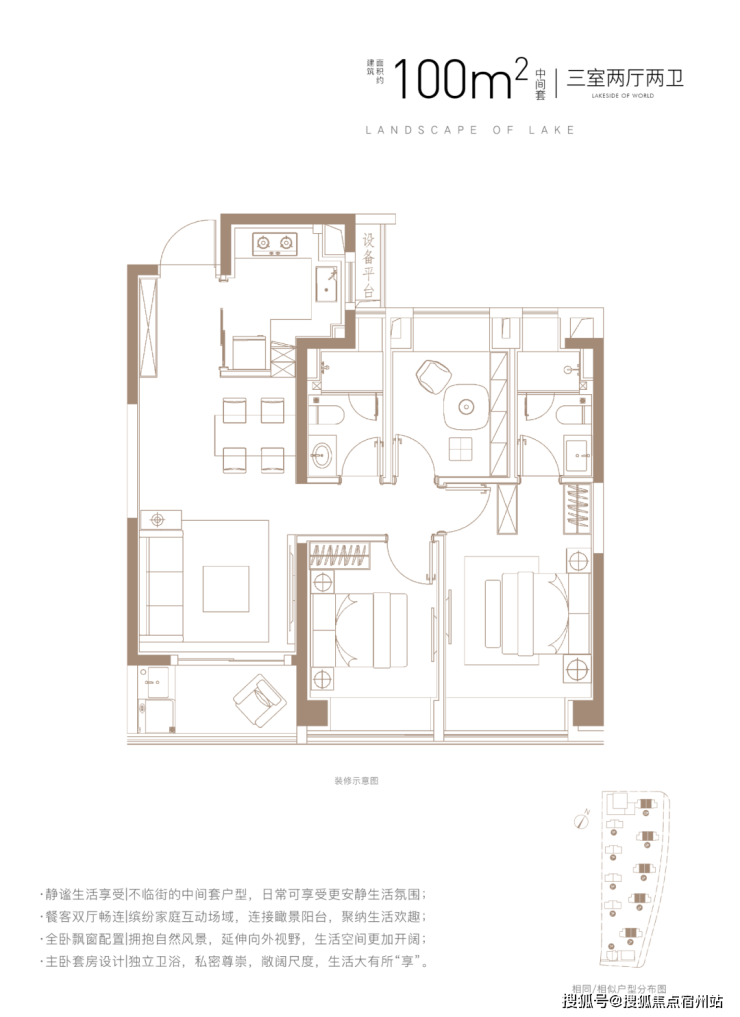 建面约100㎡3房2厅2卫,做到了 三开间朝南+主卧套房设计+动静分离+全卧室带飘窗,功能性和尺度感完美结合的3房户型。