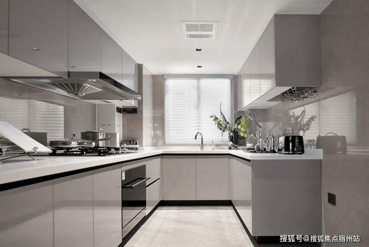厨房空间,采用铝合金玻璃PVC饰面的免漆门套及铝合金移门,三件套使用 老板的油烟机、燃气灶、洗碗机交付,更有摩恩的水槽和龙头、定制的组合橱柜。
