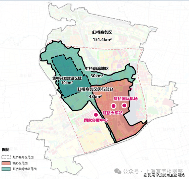 众所周知,虹桥商务区由长宁区、闵行区、青浦区以及嘉定区这4个区各自的一部分面积组成,总规划面积达到151平方公里,其中隶属于长宁区的部分称为东虹桥,隶属于青浦区的部分称为西虹桥,隶属于嘉定区的部分称为北虹桥,隶属于闵行区的部分则有48平方公里,占虹桥商务区总面积近1/3,而虹桥商务区闵行区部分又分为两部分——18平方公里的虹桥枢纽核心片区以及30平方公里的前湾片区。