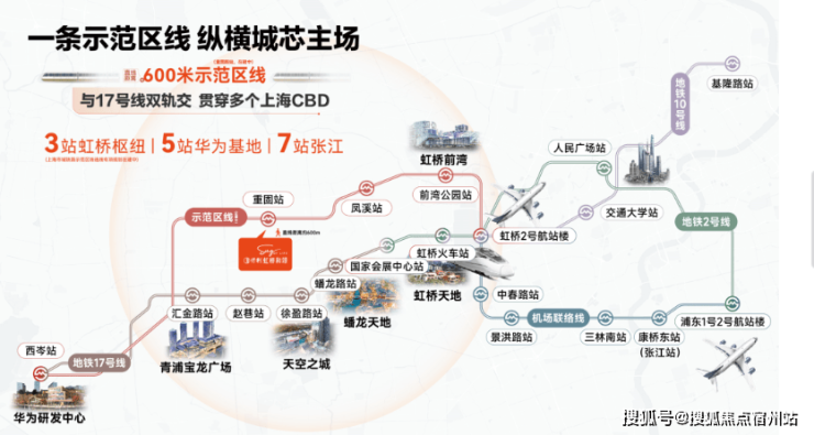 而示范区线(在建) 左手长三角一体化、华为,右手前湾、大虹桥总部商办 , 并通过虹桥枢纽,串联2号线及正在试运营的机场联络线, 把市中心、徐汇、闵行、张江等高能板块都纳入保利虹桥和颂·IN255的通勤版图。
