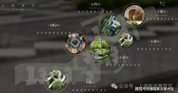 规划了 “翡色五境”五大空间氛围, 匠造融入时光、人文海派、自然与艺术、家庭与邻里的 “四轴、三园、五区、一所 ”四大功能空间。
