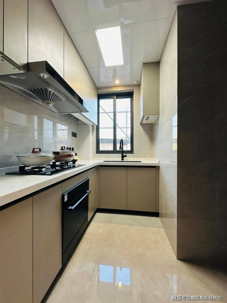 约3.2米面宽厨房,超实用U型台面布局 ,烹饪也是一种享受;餐厅与厨房同款, 轻松放置6人桌 ,尺度之大在同级项目难得一见! 厨房采用极窄边框两固两移全玻璃移门,做到极致南北通透!