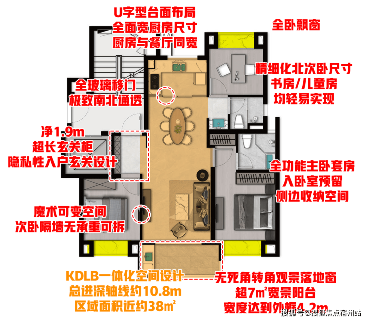 入户玄关及超大玄关柜 设计, 三开间朝南飞机户型 , KDLB一体化设计 , 客厅次卧魔术可变空间 , U型厨房 , 大尺度宽景阳台+转角观景落地窗 , 舒适北卧 , 三段式干湿分离客卫 , 全卧室飘窗 ,等等