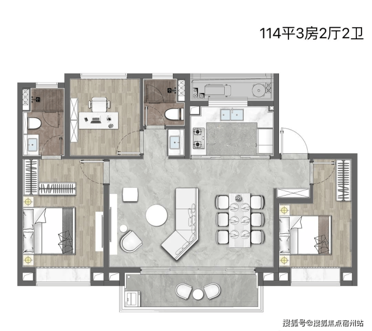 建面约114㎡三房两厅两卫户型
