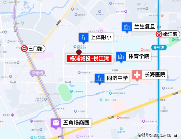 项目2.5公里半径覆盖有丰富业态,包括国华广场、中原城市广场等众多商业,海军军医大学第三附属医院、长海医院,上海市肺科医院等三甲医院,江湾体育中心,江湾湿地公园等。